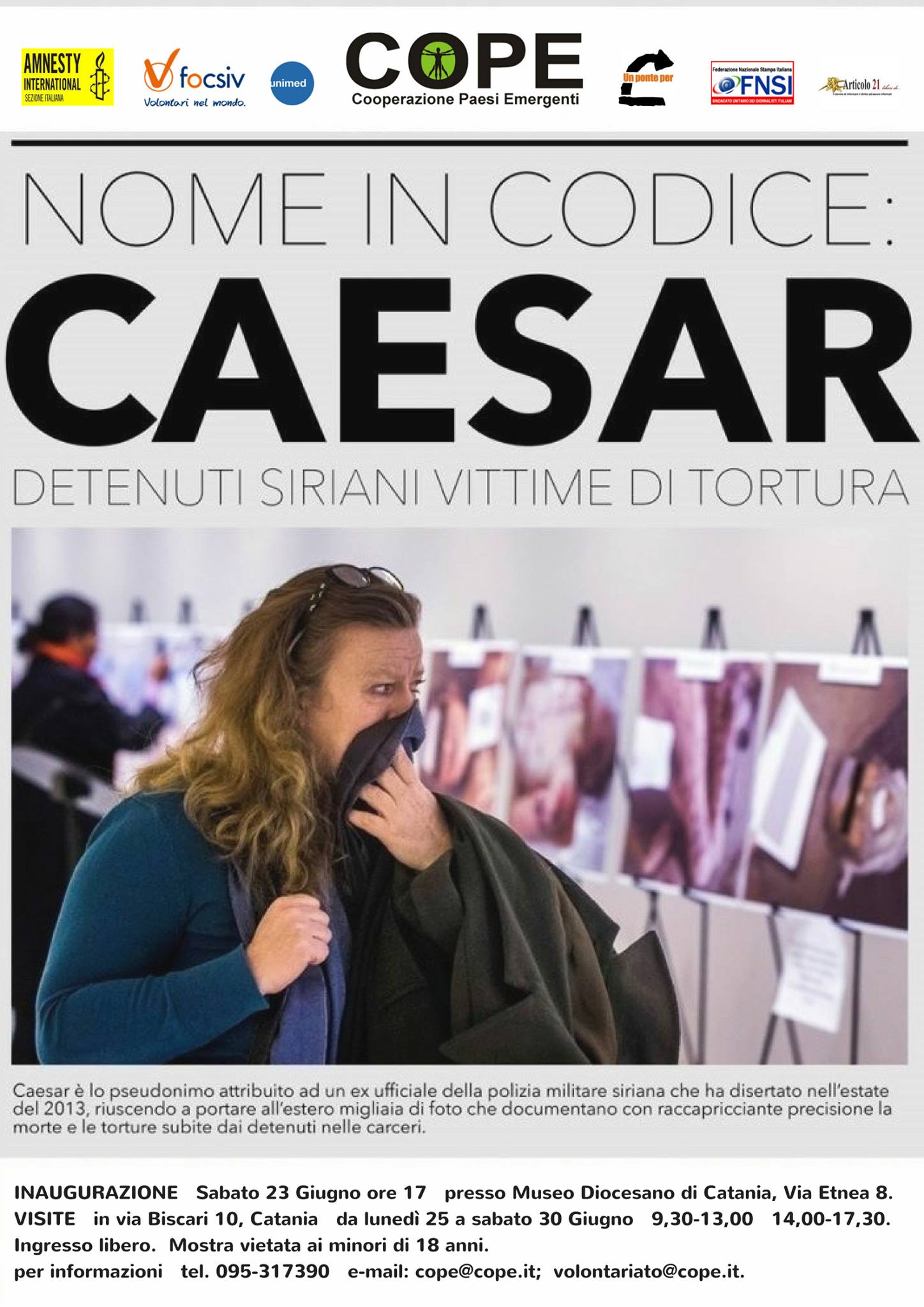 Il 23 Giugno alle ore 17,00 presso il Museo Diocesano di Catania sarà inaugurata la mostra fotografica “Nome in codice Caesar: detenuti siriani vittime di tortura”, in concomitanza con la Giornata Mondiale del Rifugiato (celebrata il 20 giugno). Le immagini scioccanti della Mostra (VIETATA AI MINORI DI 18 ANNI) voluta fortemente a Catania dal CO.P.E. dopo aver girato il mondo, mirano a far riflettere l’opinione pubblica sulla situazione di rifugiati e richiedenti asilo, sui contesti e le condizioni da cui scappano costoro. La mostra verrà inaugurata all’interno dell’Assemblea Ordinaria dei soci del CO.P.E. alla presenza del Presidente Michele Giongrandi e dei soci tutti; presenterà la mostra Valeria Gallitto(Referente per la Comunicazione del CO.P.E.), condurranno il dibattito in ambito internazionale, il Direttore del CO.P.E. Manuele Manente e il Dott. Ugo Tramballi, giornalista de “IlSole24Ore” e consulente ISPI di Politica Internazionale.